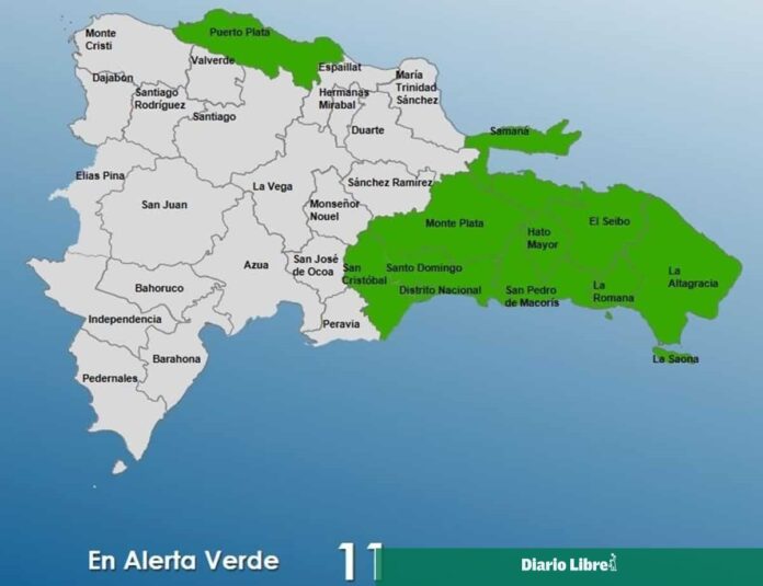El Centro de Operaciones de Emergencias (COE) amplió este domingo el nivel de alerta verde para un total de 10 provincias y el Distrito Nacional, ante el incremento de las probabilidades de que las lluvias aumenten como consecuencia de una vaguada asociada a un frente frío que se ha fortalecido en las últimas horas y se localiza sobre Haití.