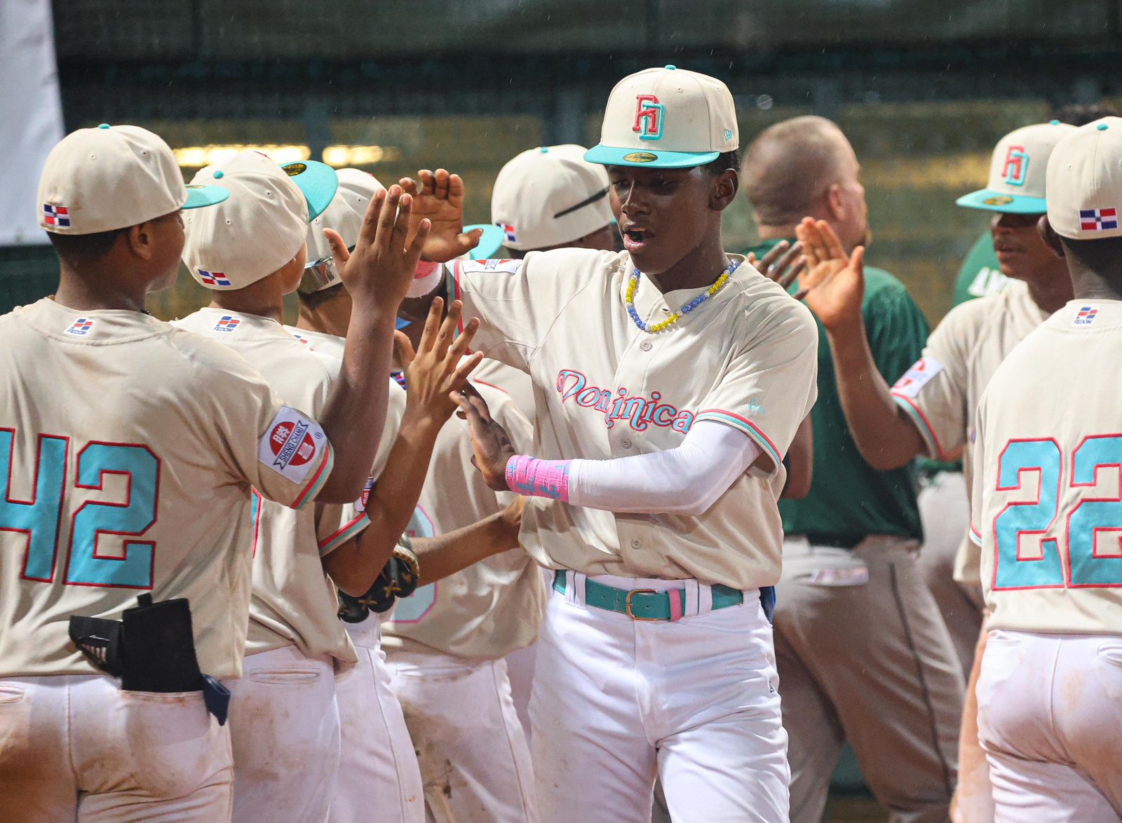 El encuentro se desarrollaba luego de dos entradas completas y el equipo dominicano ganaba fácil 10–0 cuando la lluvia dijo presente, y luego que se reanudó el partido, los quisqueyanos fabricaron 15 vueltas más.