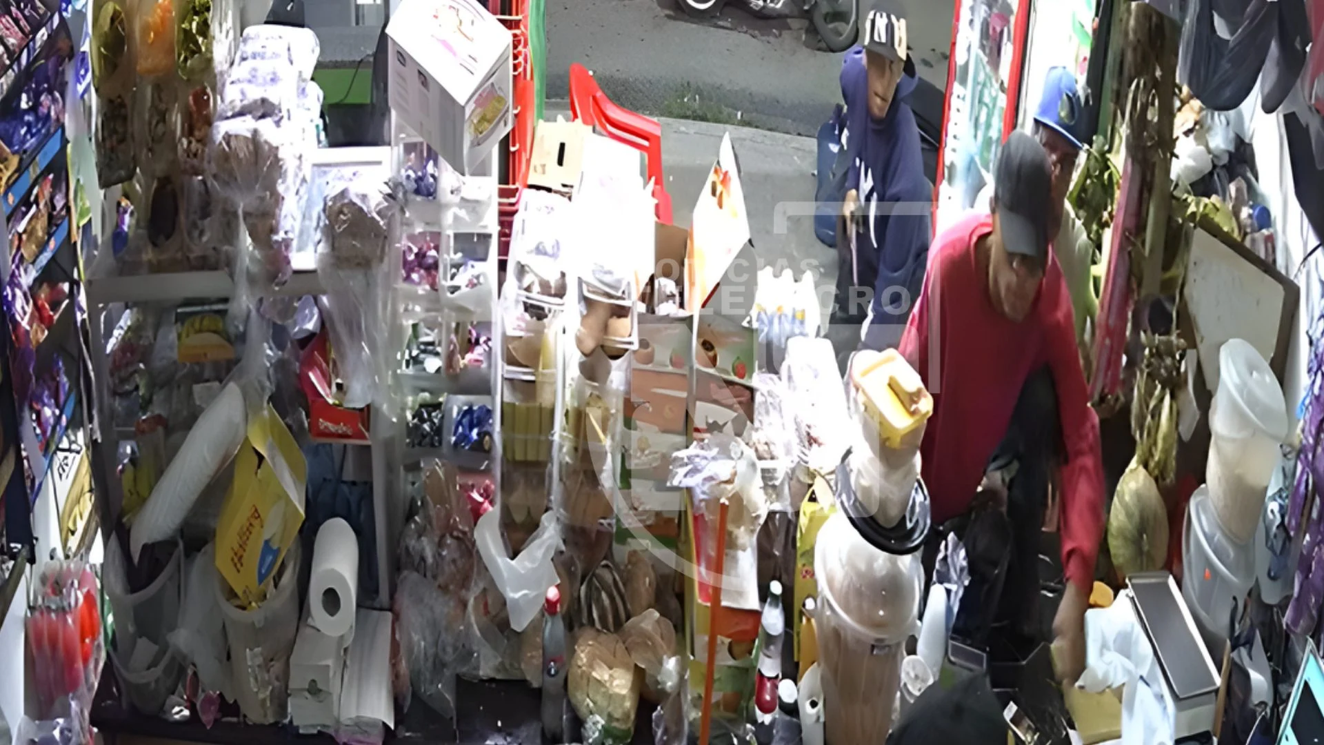 En el video se ve el momento en el que los jóvenes a bordo de una motocicleta irrumpen en el lugar y dos de ellos cruzan por encima del mostrador mientras apuntaban con un arma de fuego a los que estaban en el lugar, sustrayendo las ganancias y otras pertenencias al comerciante y clientes.