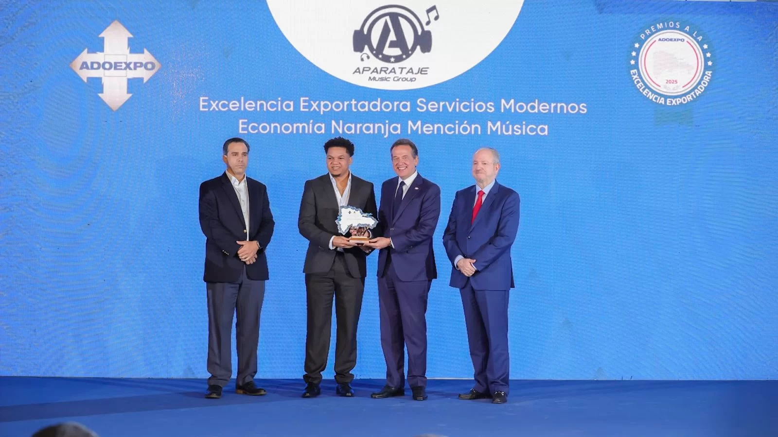 Santo Domingo.- Aparataje Distribution, empresa especializada en distribución digital de música y servicios asociados a la economía creativa, fue reconocida con el Premio a la Excelencia Exportadora 2025 en la categoría Servicios Modernos – Renglón Música, otorgado por la Asociación Dominicana de Exportadores (ADOEXPO).