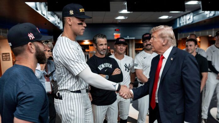 El manager Aaron Boone dijo antes de la llegada de Trump que el jardinero izquierdo de los Yankees, Anthony Volpe, había jugado con un desgarro parcial del labrum en su hombro izquierdo, sin revelarlo. Al saludarlo, Trump le dio una palmadita suave en el hombro.