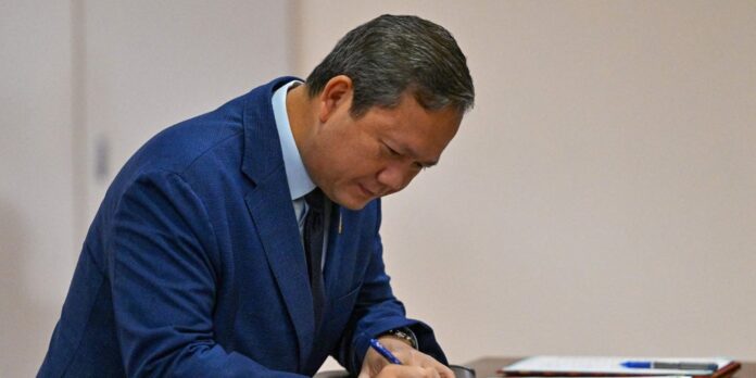 El primer ministro de Camboya, Hun Manet, se registra a su llegada para asistir a la sesión AFP