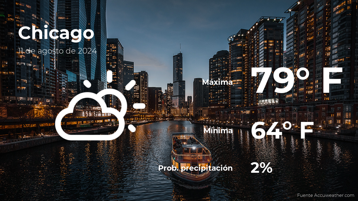 El clima en Chicago mañana se esperan nubes y claros con lloviznas generalizadas. Se estima que la temperatura máxima sea de 77 grados Fahrenheit (25 grados Celsius), mientras que la mínima estará alrededor de los 66 (19ºC). ¿Mañana llueve en Chicago? Según la información provista por AccuWeather, las probabilidades de precipitaciones son del 80% por la mañana, 25% por la tarde y 80% por la noche.