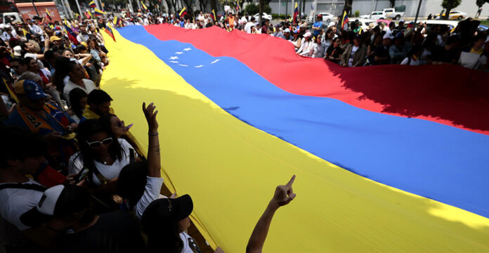 Alrededor de 400 manifestantes, según cifras de los organizadores, se congregaron esta tarde en la glorieta de Simón Bolívar, en el centro de la Ciudad de México, donde desplegaron una bandera de Venezuela de unos 100 metros de longitud.
