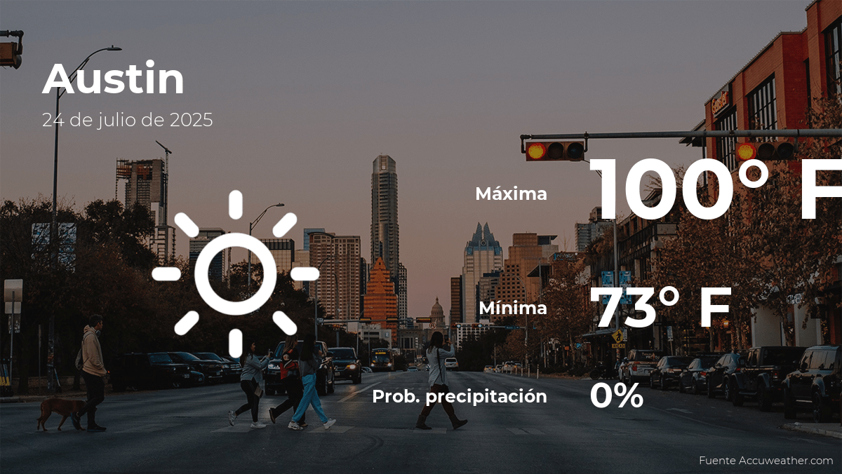 Durante la mayor parte del día en Austin, Texas, se prevén cielos despejados. Se espera una temperatura máxima de 100 grados Fahrenheit (38ºC) alrededor de las horas centrales del día y una temperatura mínima de 73 grados Fahrenheit (23ºC) durante la madrugada. También se espera un viento del sudeste, que podría llegar a los 6.84 mph en el día. El porcentaje de nubosidad será del 11%.