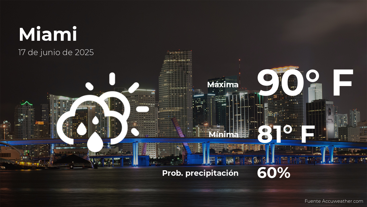 El pronóstico del clima de hoy en Miami para este martes 17 de junio indica que los termómetros llegarán hasta un máximo de 90 grados Fahrenheit (32ºC) en la Magic City. Por su parte, la probabilidad de lluvia será del 60% y se esperan nubes y claros, mientras que las ráfagas de viento llegarán a las 11.18 mph de máxima en el día y los 9.32 mph por la noche.