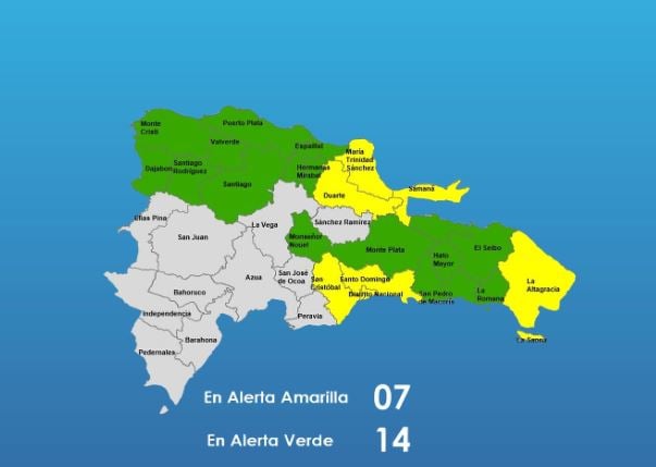 Las provincias en alerta amarilla son: Santo Domingo, Distrito Nacional, María Trinidad Sánchez, La Altagracia, Duarte, Samaná y San Cristóbal. Mientras que en alerta verde están:Hermanas Mirabal, Puerto Plata, San Pedro de Macorís, Monte Plata, Valverde, Monseñor Nouel, Espaillat, Hato Mayor, Santiago, El Seibo, Dajabón, La Romana, Santiago Rodríguez y Montecristi.