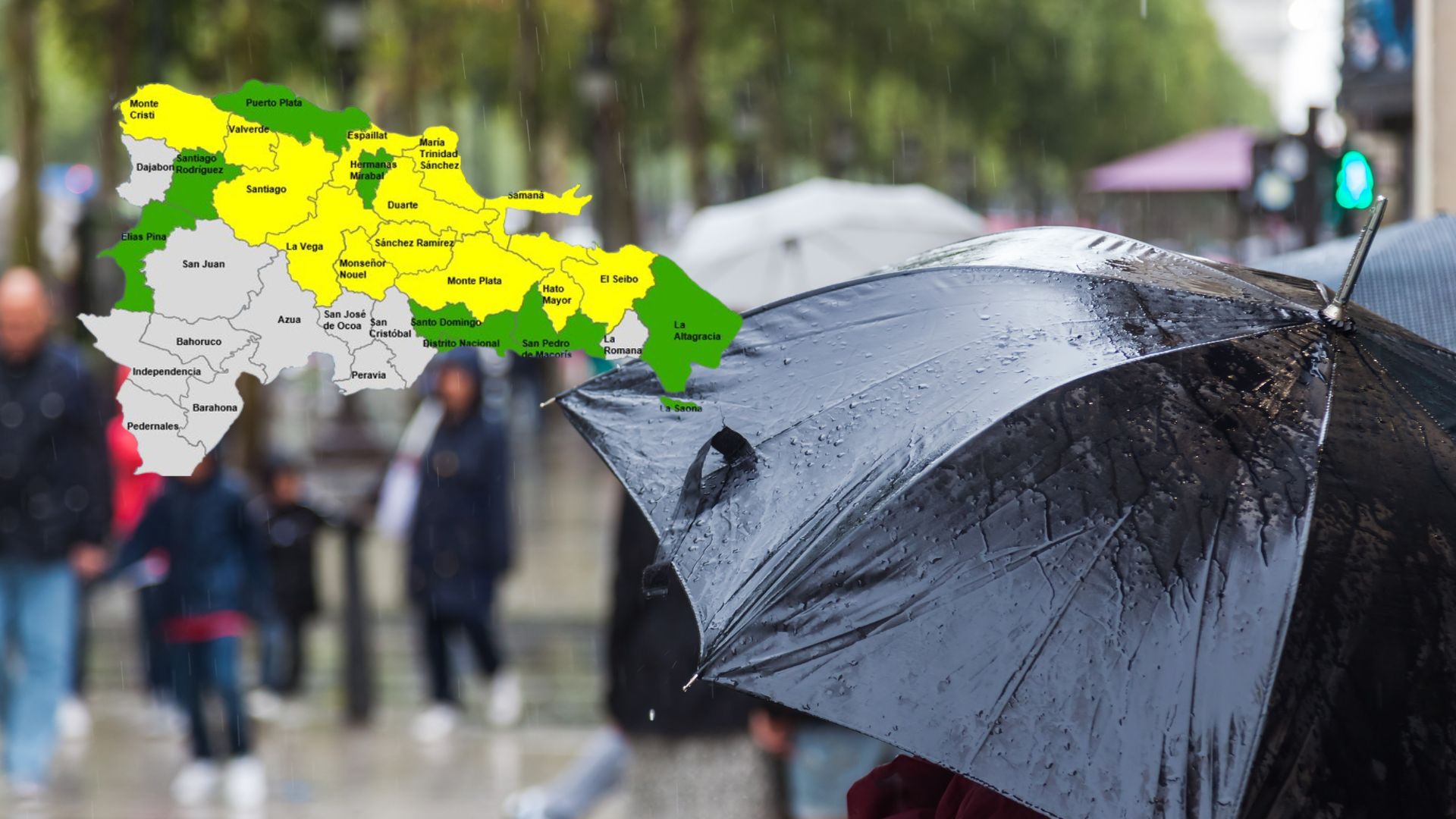 Las provincias en alerta amarilla son: María Trinidad Sánchez, La Vega, Monseñor Nouel, Monte Cristi, Valverde, Hato Mayor, Espaillat, Duarte, Sánchez Ramírez, Monte Plata, Santiago, Samaná y El Seibo.