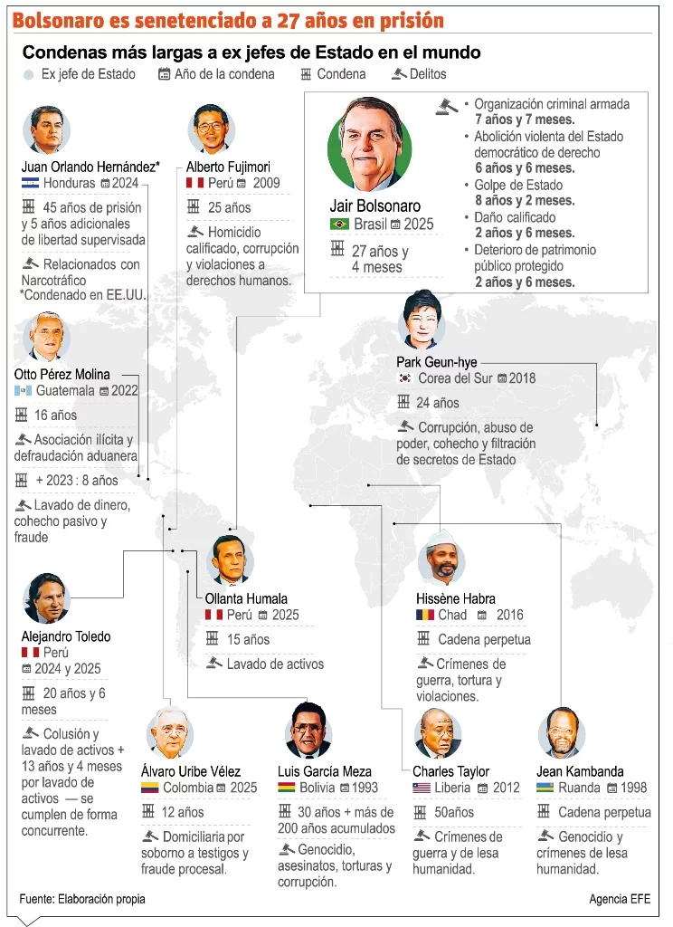 — CondenaEl jueves, por cuatro votos a uno, la Sala Primera del Supremo Tribunal de Brasil condenó a Bolsonaro a 27 años y 3 meses de cárcel por “liderar” un complot golpista para “perpetuarse en el poder”.