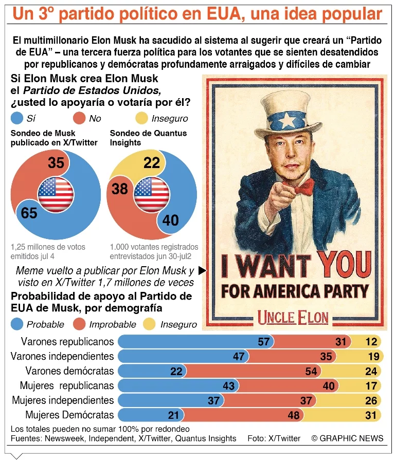 — CríticaDonald Trump anticipó el fracaso de un tercer partido político en Estados Unidos después de que el empresario Elon Musk anunciara la creación de America Party. El partido ya se registró ante la Comisión Electoral Federal.