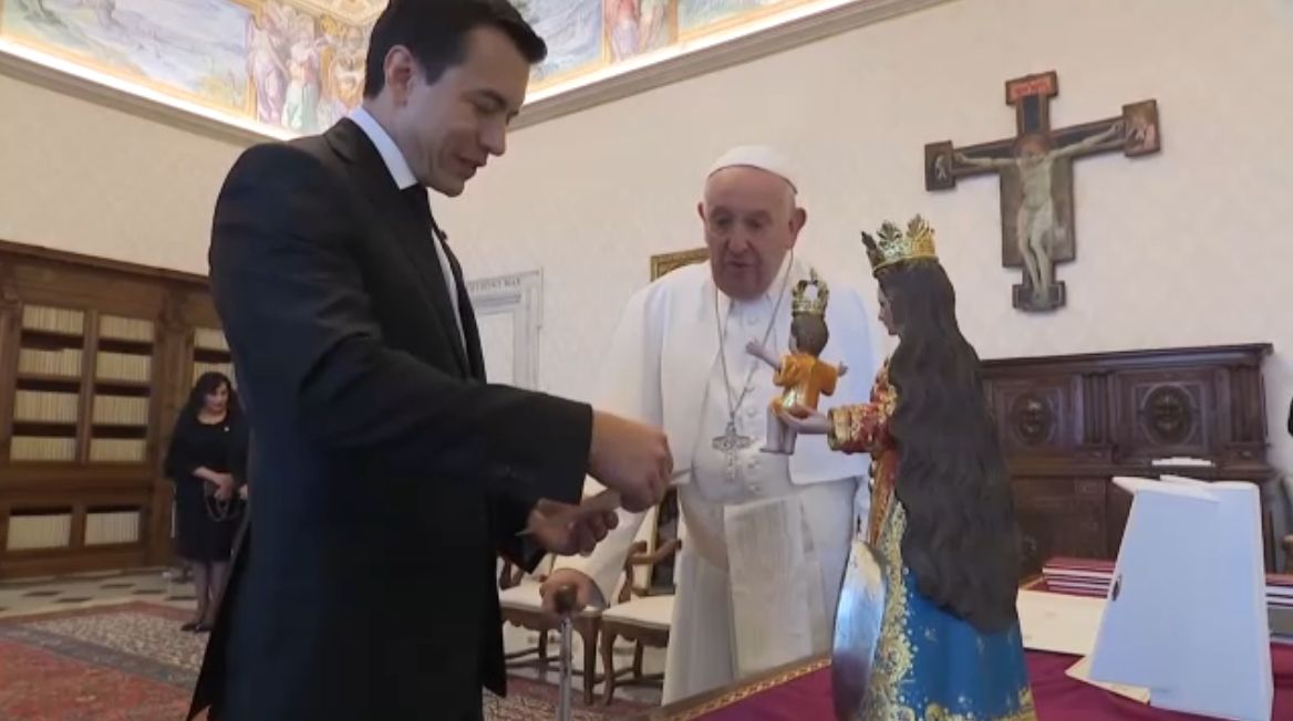 El papa Francisco se reunió este lunes por primera vez con el presidente de Ecuador, Daniel Noboa, quien le regaló una reproducción de la Virgen del Cisne, realizada por artesanos de su país.