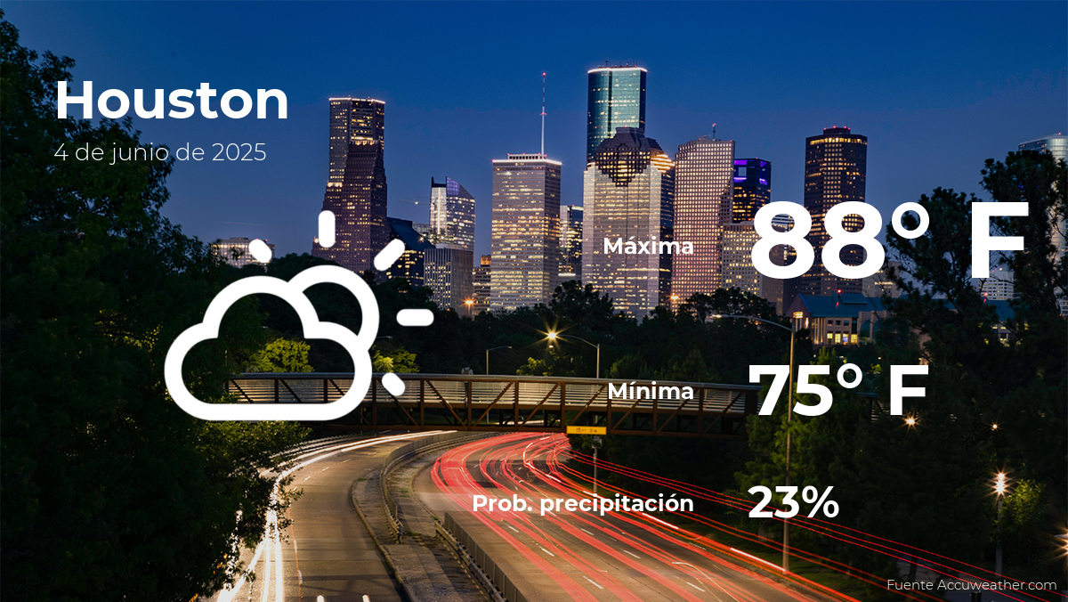 El clima en Houston, Texas, para este miércoles 4 de junio contarácon escasa nubosidad. De acuerdo al parte meteorológico provisto por AccuWeather, la temperatura se incrementará hasta un total de 88 grados Fahrenheit (31ºC) de máxima durante el día, mientras que a la noche se registrará la temperatura más baja, con 75 grados Fahrenheit (24ºC) de mínima.
