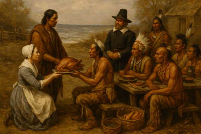 El origen de Thanksgiving suele ubicarse en 1621, cuando los peregrinos ingleses de la colonia de Plymouth compartieron un banquete con miembros de la nación Wampanoag. Los peregrinos habían llegado en 1620 huyendo de persecuciones religiosas. El primer invierno fue devastador: murieron aproximadamente la mitad de los colonos. Los Wampanoag, liderados por el gran sachem Massasoit, también enfrentaban presiones bélicas de otras tribus y vieron en los ingleses un posible aliado estratégico.