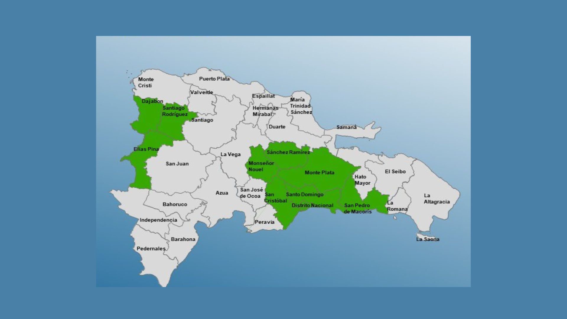 Las provincias afectadas por la alerta verde son Santo Domingo, San Pedro de Macorís, Monte Plata, Sánchez Ramírez, Santiago Rodríguez, Dajabón, Elías Piña, San Cristóbal, Monseñor Nouel y el Distrito Nacional.