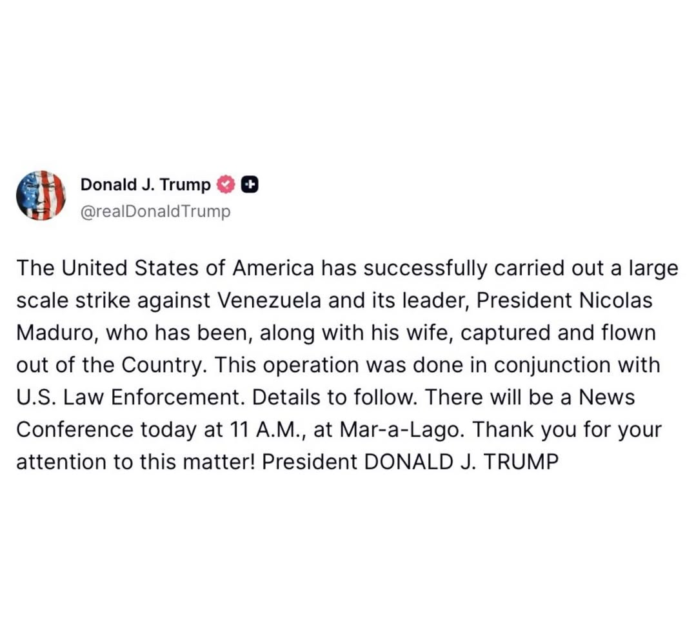 La Embajada de Estados Unidos en República Dominicana confirmó este sábado el anuncio del presidente Donald Trump sobre una operación ejecutada en territorio venezolano que culminó exitosamente. Trump informó que la acción coordinada resultó en la captura y retirada de Nicolás Maduro y su esposa, quienes se encuentran bajo custodia de autoridades estadounidenses.
