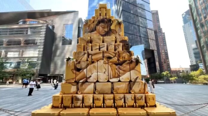 Afuera, en la plaza principal del recinto, una pirámide dorada de 20 pies de altura y hecha de 200 neveras plásticas, rinde homenaje a los inmigrantes de Estados Unidos.