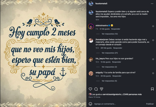 En el mismo mensaje, añadió: *«Espero que estén bien y si alguien está cerca de ellos me ayuden diciéndole que los extraño, ya que con la madre será imposible. Los amo, mis hijos».*