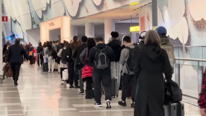 Frustracion de viajeros ante largas colas en aeropuertos