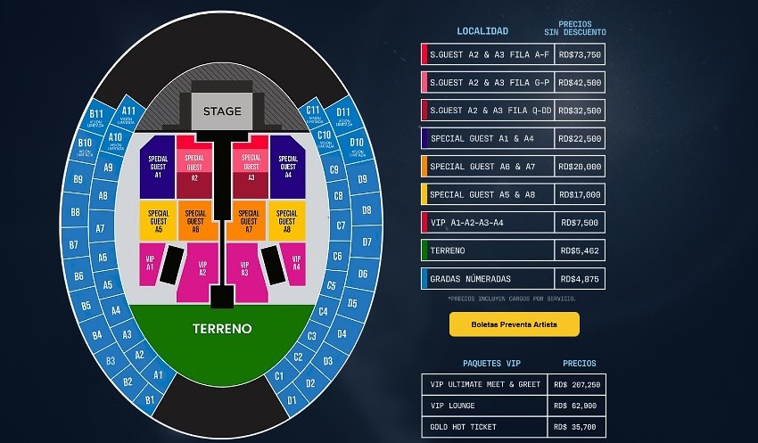 Special Guest A2 y A3 fila Q-DD tendrá un valor de RD$32,500, las filas G-P en RD$42,500 y las filas A-F RD$73,750.