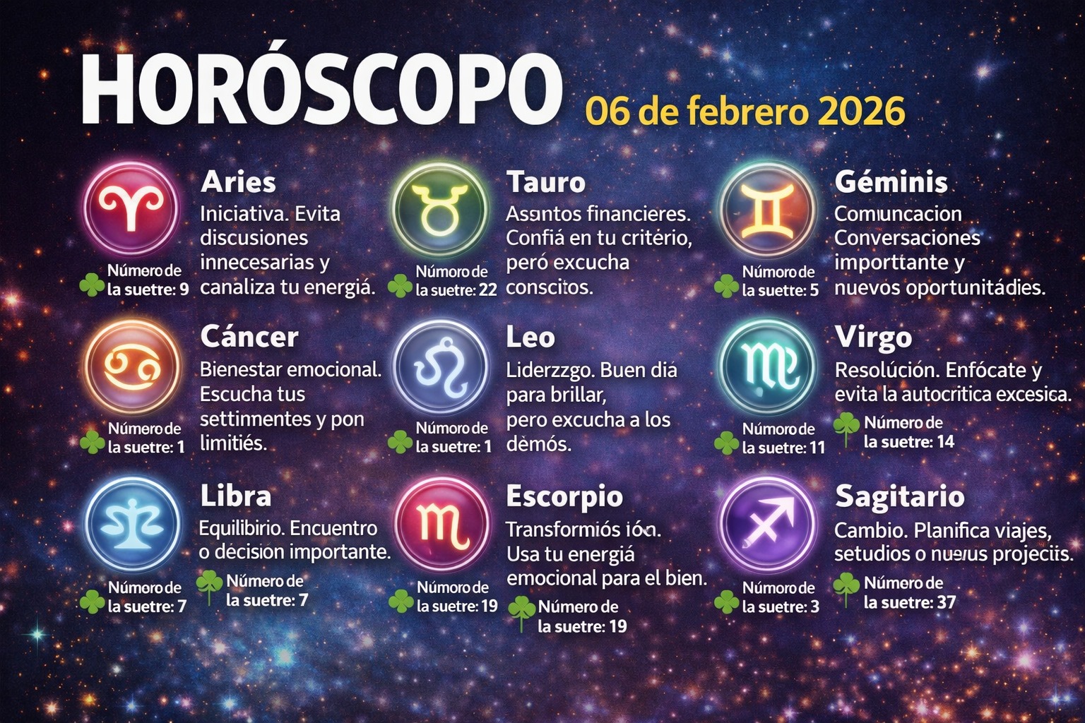 El viernes 6 de febrero de 2026 llega con energías de claridad, comunicación y decisiones importantes. Es un día propicio para cerrar acuerdos, expresar sentimientos y avanzar con determinación en asuntos personales y laborales. La intuición jugará un papel clave, pero también será necesario actuar con prudencia.