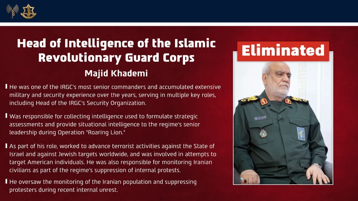 La Guardia Revolucionaria iraní confirmó este lunes la muerte en un ataque de su jefe de Inteligencia, Mayid Jadami, tal como había informado anteriormente Israel, en el más reciente asesinato de un alto cargo de la República Islámica en la guerra.
