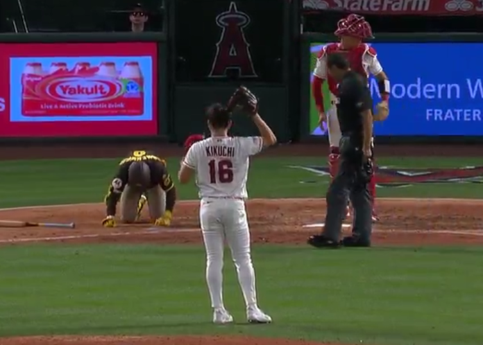 El zurdo Yusei Kikuchi lanzó una bola alta y pegada que terminó impactando en la cara del segunda base de los Padres. El lanzamiento, que parecía inofensivo al principio, rozó el hombro de Cronenworth antes de golpearlo directamente en la barbilla.