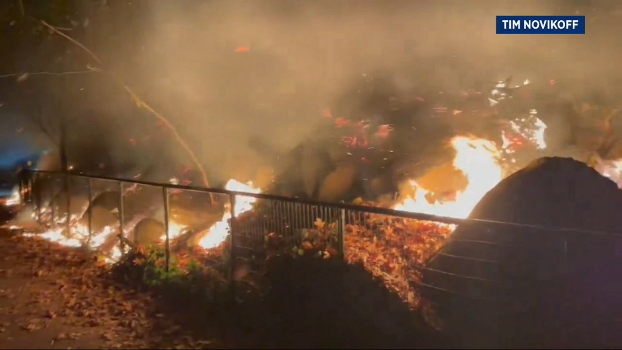 En medio de la oscuridad, las intensas llamas se veían entre los bomberos que llegaron en la noche del viernes a controlar el incendio forestal, en el sector del parque conocido como la explanada de Nethermead, en Prospect Park.