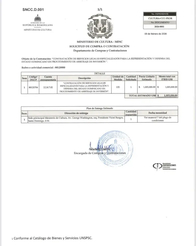 El expediente indica que la solicitud fue tramitada por el Departamento de Compras y Contrataciones del Ministerio de Cultura, y tiene como objetivo la contratación de asesoría legal especializada para la defensa del Estado en un arbitraje de inversión, un tipo de proceso que generalmente implica litigios de alto nivel y costos significativos.