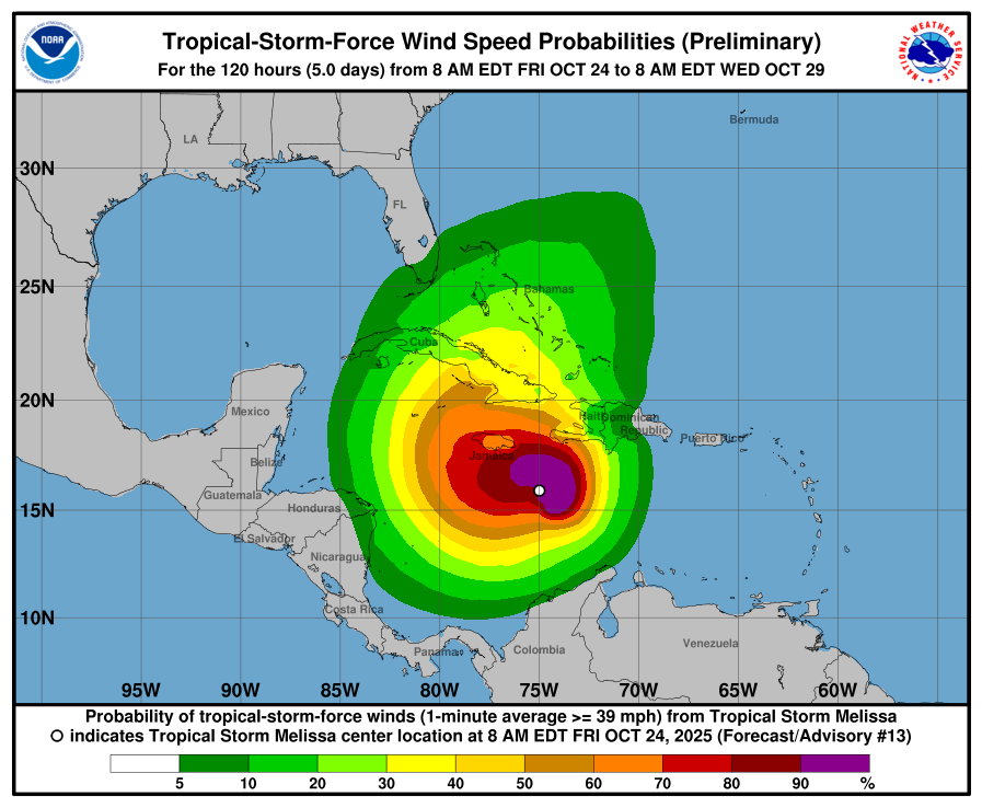 Se pronostica un fortalecimiento gradual durante el viernes, seguido de una intensificación rápida durante el fin de semana, con posibilidad de que Melissa se convierta en huracán mayor para el domingo. Los vientos con fuerza de tormenta tropical se extienden hasta 140 millas (220 km) desde el centro.