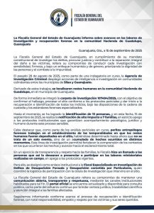 La Fiscalía de Guanajuato confirmó el hallazgo de una fosa clandestina en la comunidad Hacienda de Guadalupe, México, zona limítrofe con Silao. En el sitio se han recuperado 17 cuerpos, de los cuales 13 ya fueron identificados, y siete familias han recibido notificación oficial.