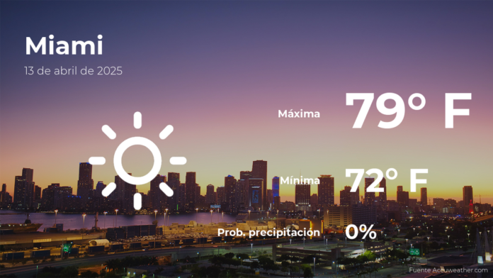 El pronóstico del clima de hoy en Miami para este domingo 13 de abril indica que las temperaturas alcanzarán un máximo de 79 grados Fahrenheit (26ºC) en la ciudad.