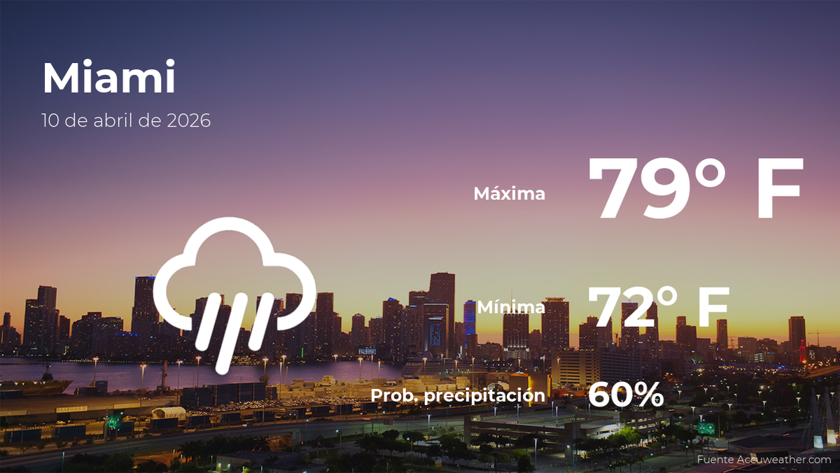 El pronóstico del clima de hoy en Miami para este viernes 10 de abril indica que los termómetros llegarán hasta un máximo de 79 grados Fahrenheit (26ºC) en la Magic City. Por su parte, la probabilidad de lluvia será del 60% y habrá cielos cubiertos, mientras que las ráfagas de viento llegarán a las 16.16 mph de máxima en el día y los 16.16 mph por la noche.