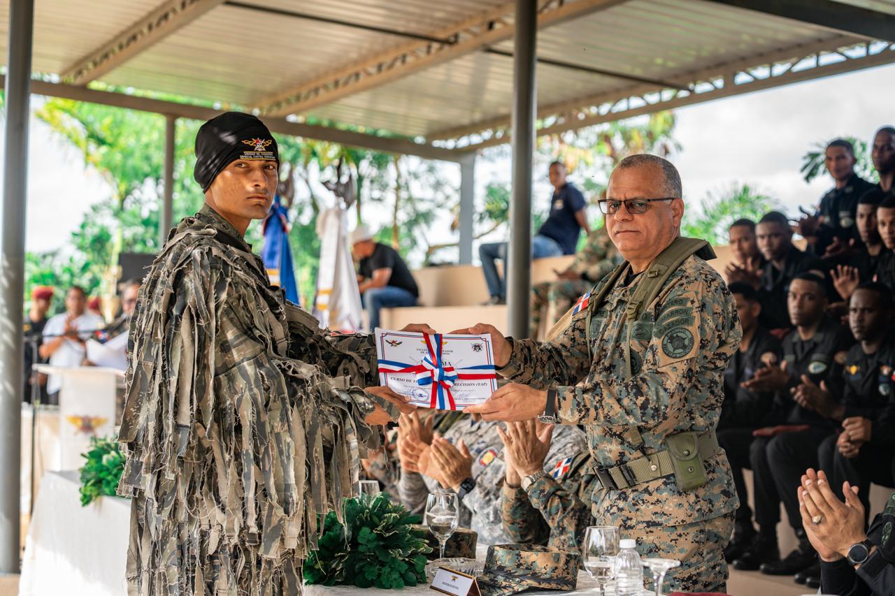 Durante el acto fueron entregadas distinciones a los participantes más sobresalientes y se impusieron las insignias correspondientes a cada curso, símbolo del cumplimiento exitoso de una formación rigurosa que eleva los estándares de preparación, profesionalismo y alistamiento de las Fuerzas Armadas de la República Dominicana.
