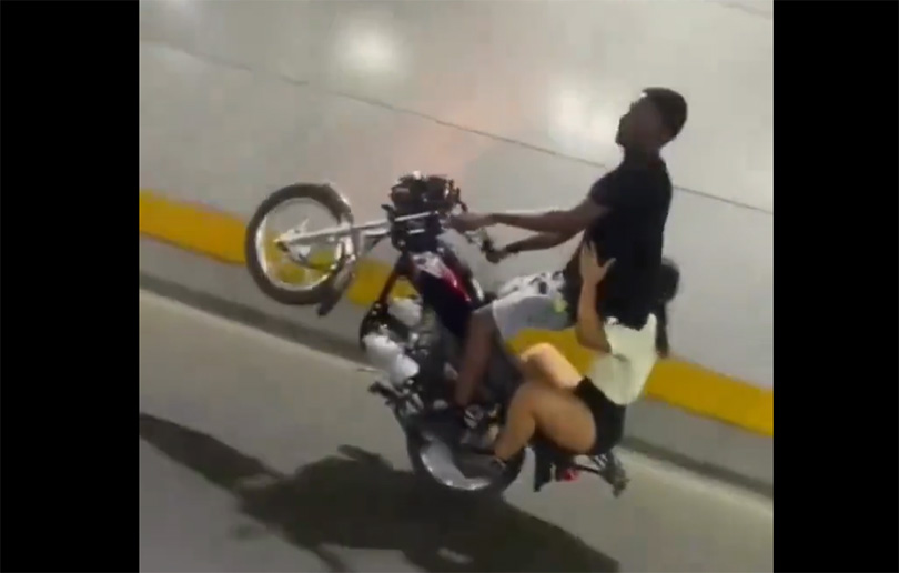 En las imágenes, el conductor levanta la rueda delantera de la motocicleta mientras circula a alta velocidad, acompañado de una joven que va como pasajera, sin ningún tipo de protección.⁣
