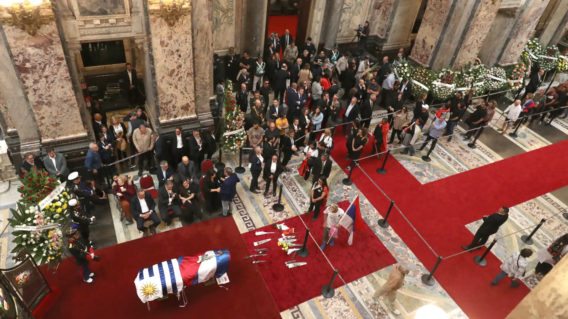 Muchos de los que fueron ingresando lo hicieron con banderas uruguayas, del Movimiento de Participación Popular -creado por Mujica- y del Frente Amplio. Algunos lo hicieron en silencio, otros en llanto y parte importante trajo consigo ofrendas florales que dejaron frente al féretro. Uno de los homenajes más destacados de este jueves fue el de una mujer que se paró delante de los restos de Mujica y entonó la canción El Adiós, del grupo español Amigos de Gines.