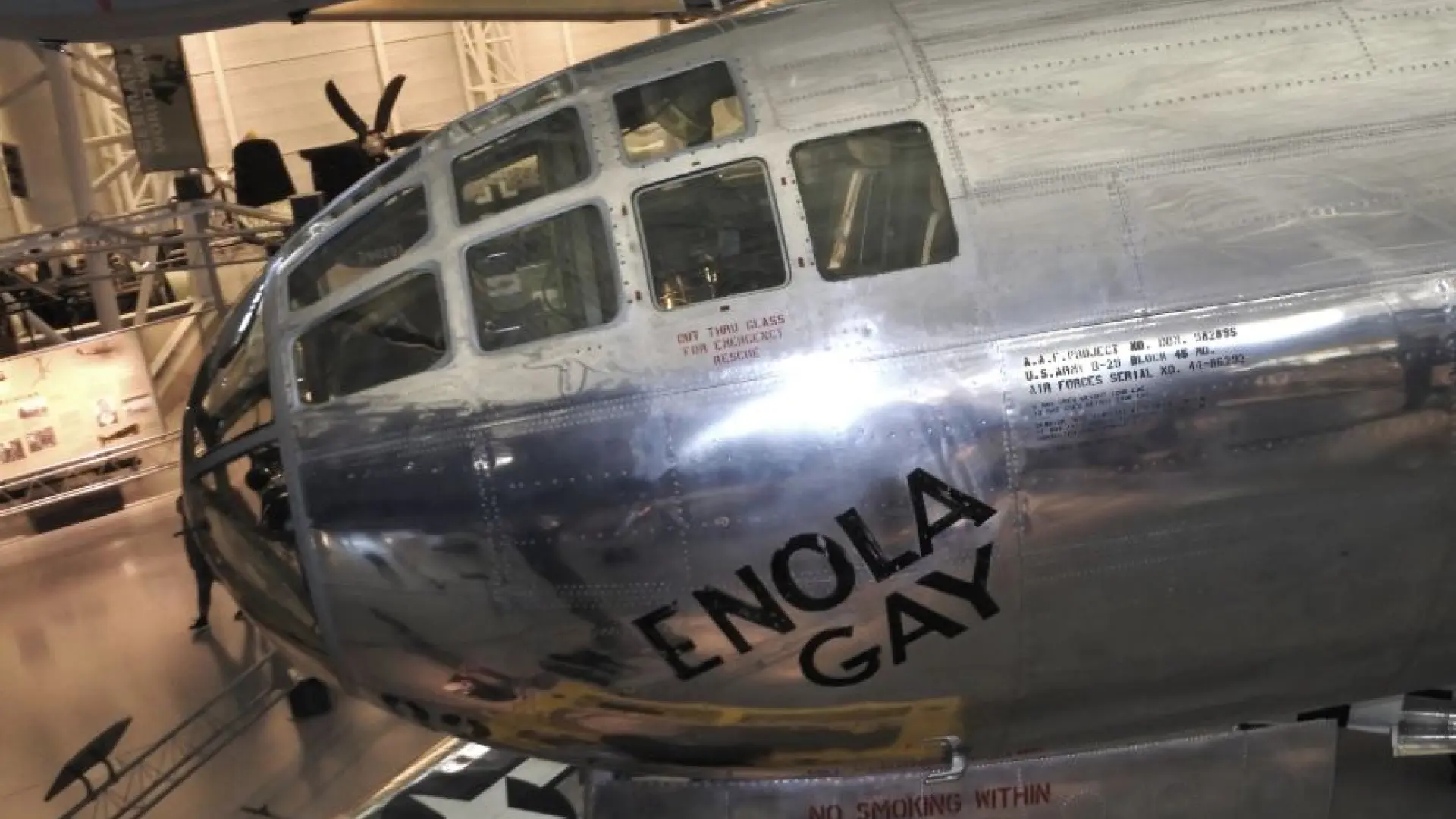 Entre los elementos marcados para su eliminación se encuentra el avión Enola Gay de la Segunda Guerra Mundial, que debía su nombre a Enola Gay Tibbets, la madre del piloto militar Paul Tibbets.
