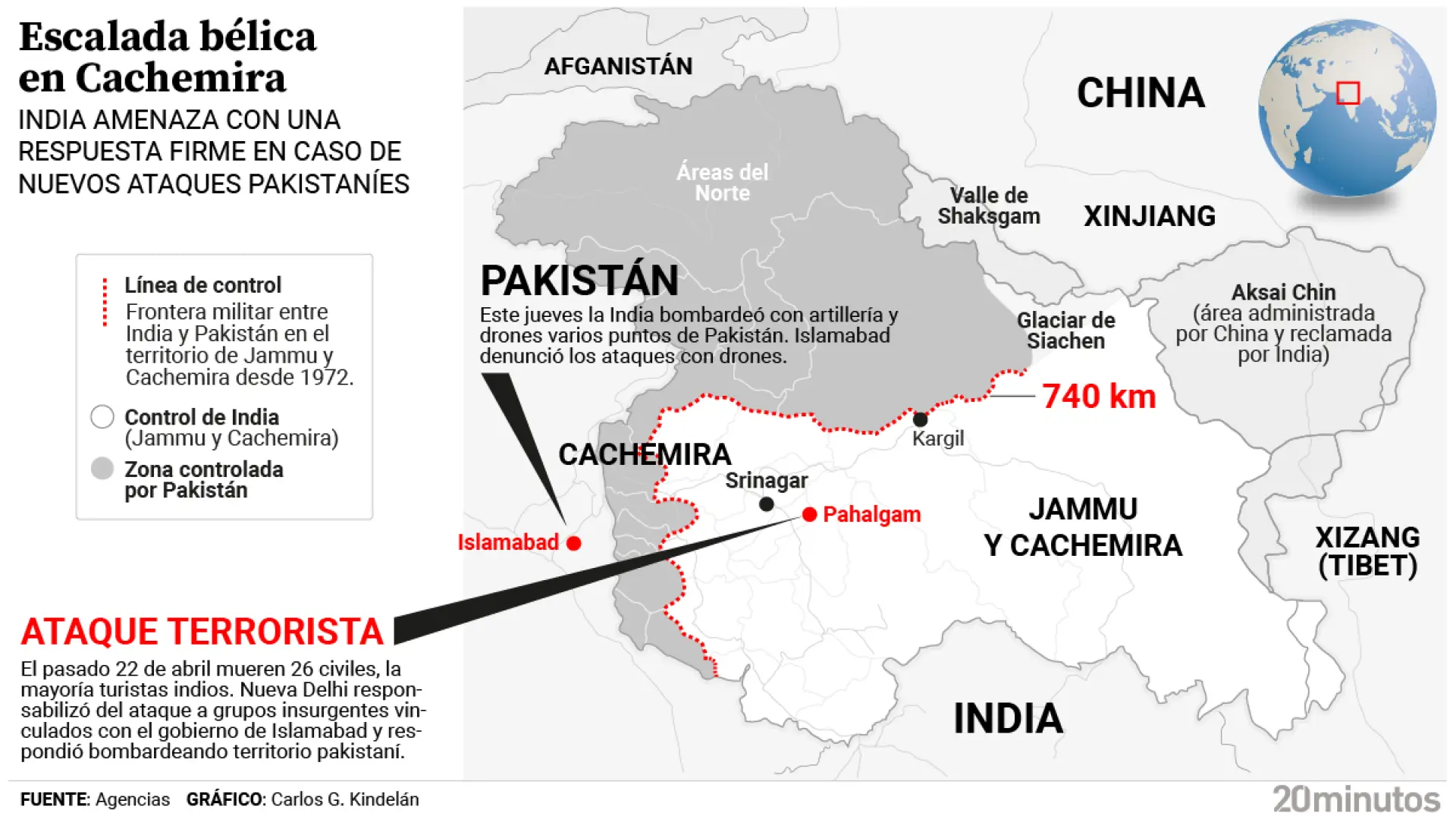 La actual escalada bélica tiene su origen en el ataque terrorista ocurrido el pasado 22 de abril en Pahalgam, en la Cachemira india, que le costó la vida a 26 civiles, la mayoría turistas indios. Nueva Delhi responsabilizó del ataque a grupos insurgentes vinculados con el gobierno de Islamabad y respondió bombardeando territorio pakistaní. Desde entonces, los ataques y escaramuzas han sido constantes a ambos lados de la llamada Línea de control (LOC), la frontera de facto entre India y Pakistán desde 1972.
