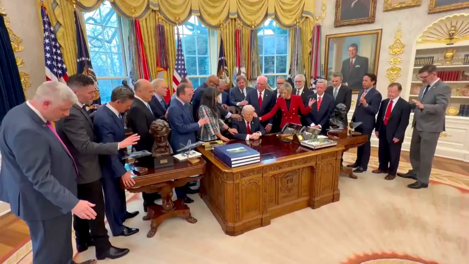 Durante la escena, casi mesiánica, Trump cierra los ojos y agacha la cabeza con gesto calmado. El momento ha sido grabado y difundido por diferentes cargos de la propia administración, reforzando la idea de unidad entre moral religiosa y la gestión política que el magnate republicano ha empleado a lo largo de los años.
