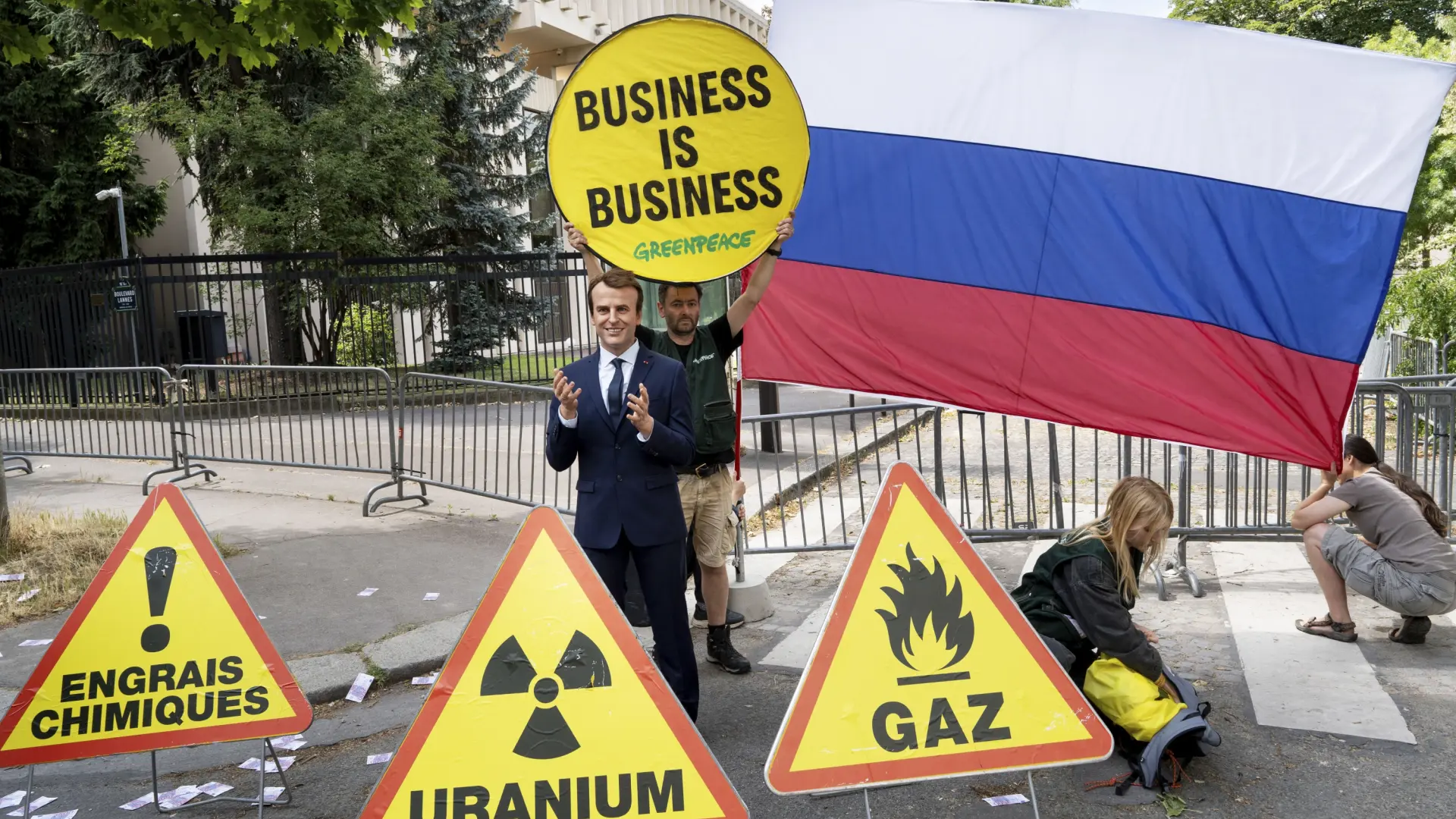 Emmanuel Macron, en su versión de cera, aparece frente a la embajada rusa en París en una acción reivindicada por Greenpeace. Varios activistas han sustraído este lunes la estatua del presidente francés del museo Grévin valorada en 40.000 euros para ser exhibida frente a la embajada de Rusia en la capital francesa.