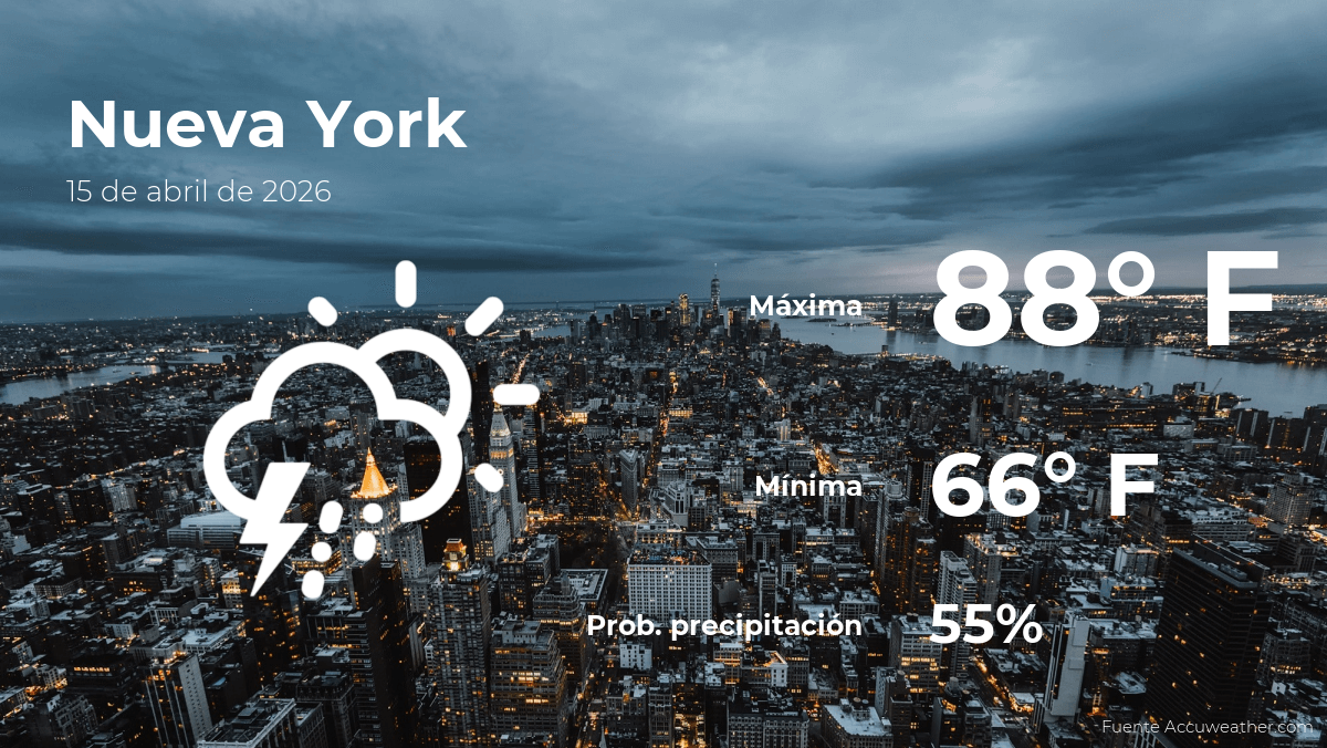 ¿Aún no sabes qué ropa ponerte para salir por las calles de Nueva York este miércoles? El pronóstico del clima para las próximas horas en la ciudad que nunca duerme indica una temperatura máxima de 88 grados Fahrenheit (31ºC) y una mínima de 66 grados Fahrenheit (19ºC). La sensación térmica, es decir, “temperatura real” que tu cuerpo va a experimentar será de 91ºF (33ºC) de máxima y 91ºF (33ºC) de mínima.