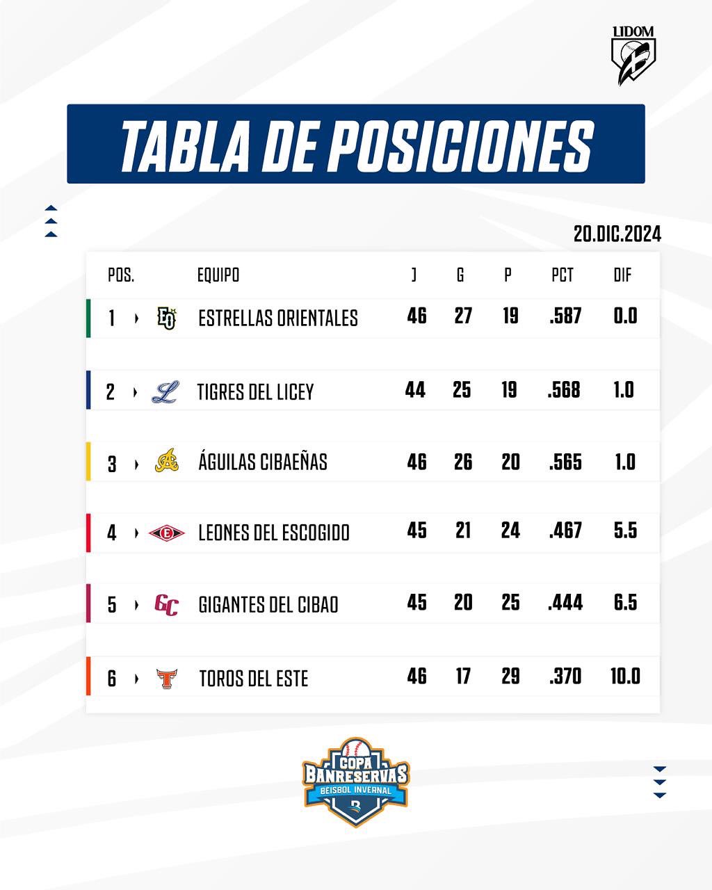 ⚾ Así quedaron las posiciones del béisbol dominicano: