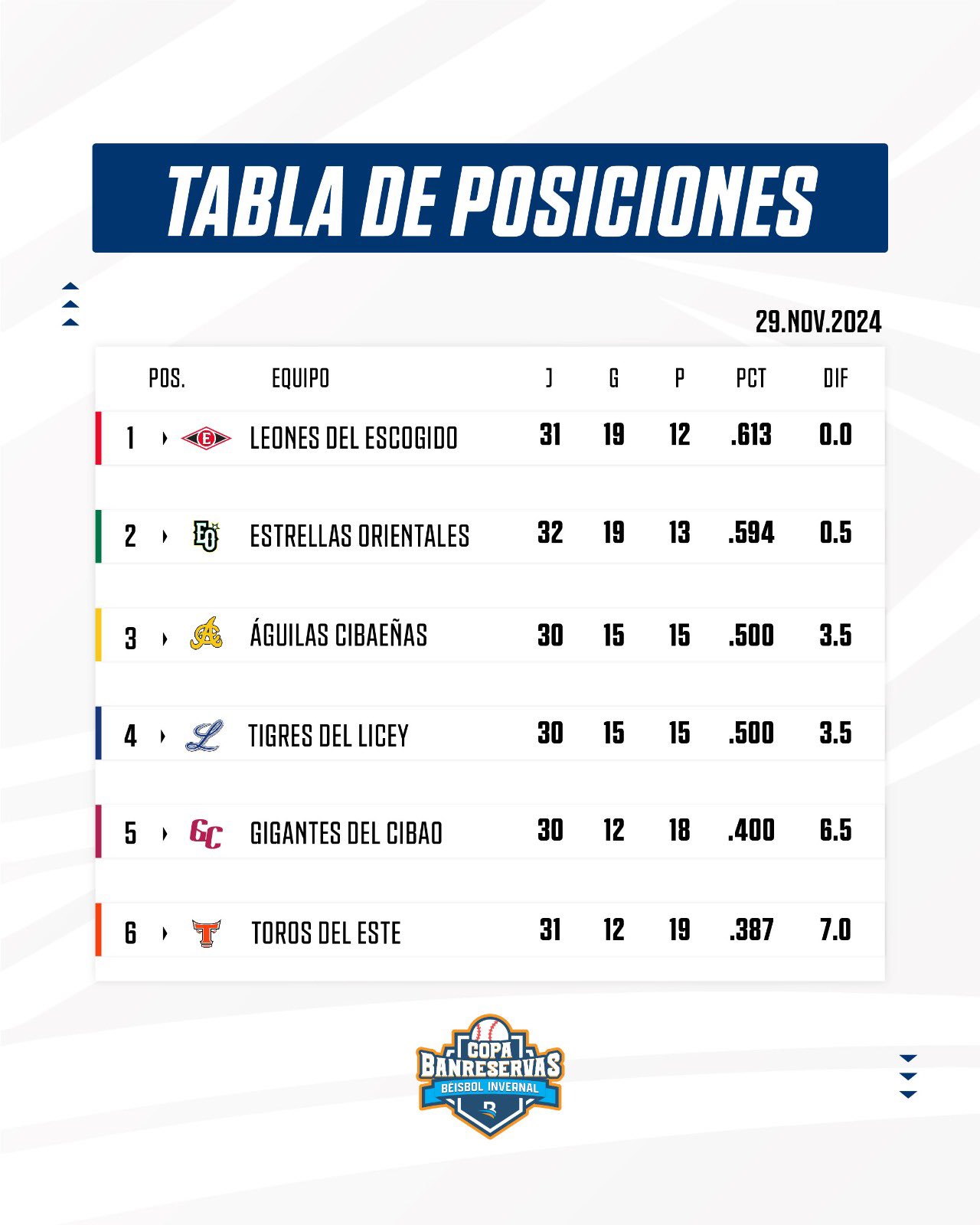 ⚾ Así quedaron las posiciones del béisbol dominicano: