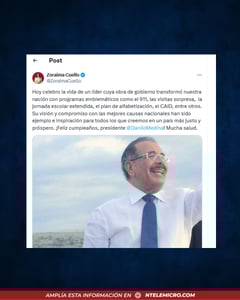 Zoraima Cuello, excandidata a la vicepresidencia por el PLD, compartió en sus redes un mensaje destacando «la visión y el compromiso» de Medina, calificándolo como «un ejemplo e inspiración para quienes anhelan un país más justo y próspero».