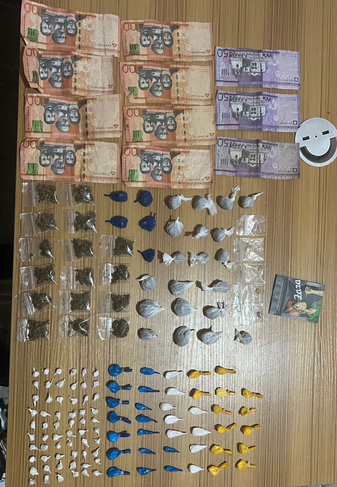 Al momento de la detención y realizarle la requisa protocolar se le ocupó 60 porciones de presunto crack, 39 de cocaína, 42 de marihuana, 5 porciones de metanfetamina (Hole), distribuidas en diferentes recortes plásticos y la suma de 950 pesos en efectivo.