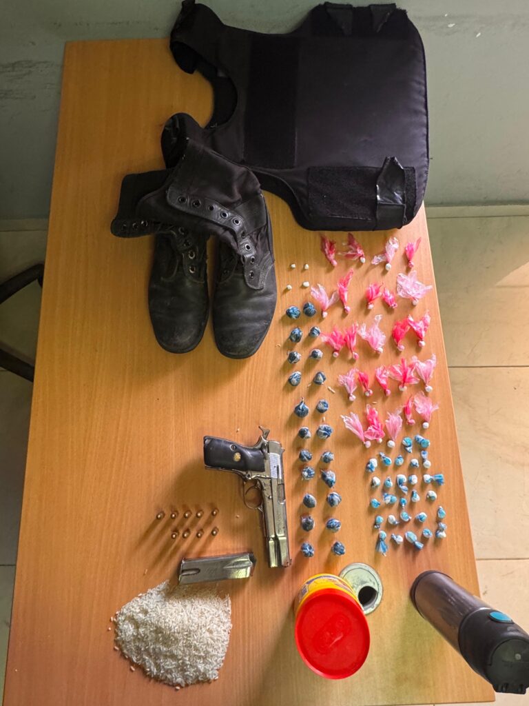Al ser registrada la vivienda, las autoridades ocuparon un arma de fuego marca Browning, sin numeración legible, con su cargador y tres cápsulas, un chaleco antibalas, un par de botas militares, seis cápsulas calibre 9mm, y varias porciones de sustancias prohibidas.