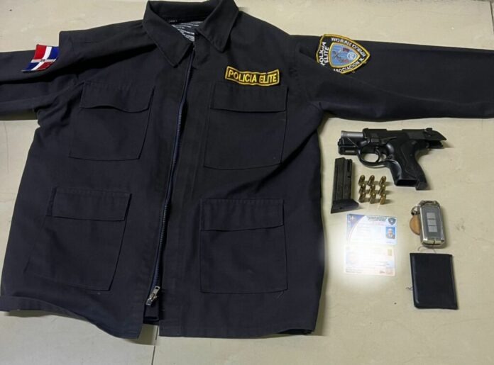 La Romana.– Miembros de la Policía Nacional detuvieron a un hombre por porte ilegal de arma de fuego, así como por el uso indebido de distintivos institucionales, al ocuparle un abrigo con el logo de la Policía Élite y un carné de la Asociación Nacional de Policías Municipales Rescatando Valores.
