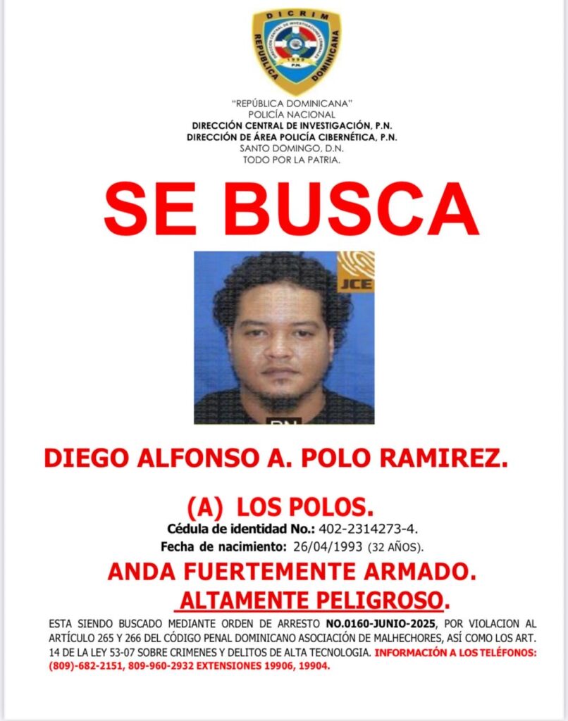 El tercero, Winal Freddy Polo Peralta, también conocido como Los Polos, de 29 años, es buscado mediante orden de arresto No. 0159-junio-2025, por los mismos cargos de asociación de malhechores y delitos de alta tecnología. Al igual que los otros implicados, se advierte que anda fuertemente armado y es considerado altamente peligroso.