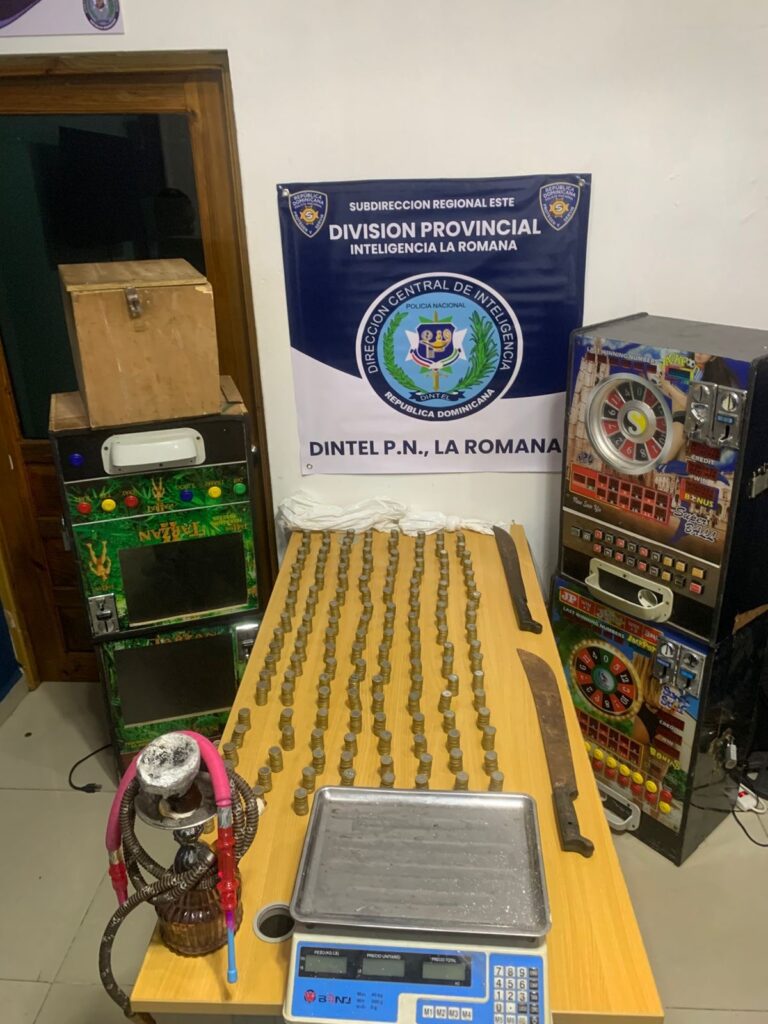 En otra intervención realizada en la calle Sagrario Díaz, también en Villa Verde, las autoridades incautaron cuatro máquinas tragamonedas, una hookah y dos mangueras para su uso, dos machetes y una suma de dinero en efectivo.