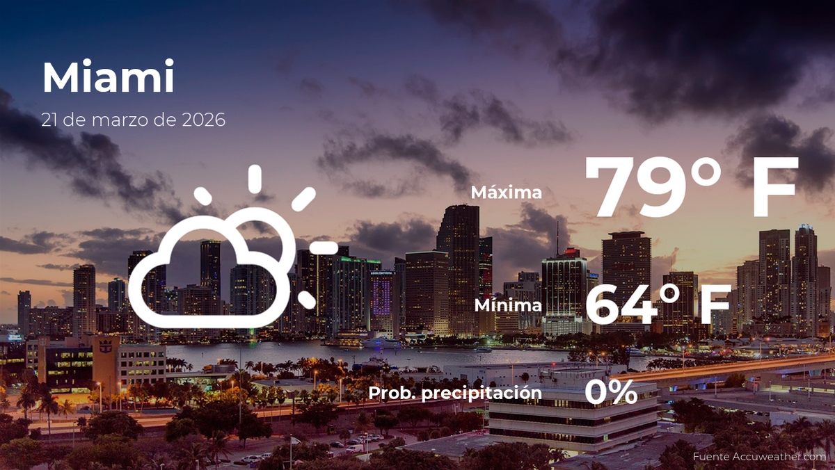 En cuanto al clima en Miami mañana, el pronóstico indica que habrá nubes escasas. Las temperaturas oscilarán entre los 64 y los 79 grados Fahrenheit (18 y 26ºC).