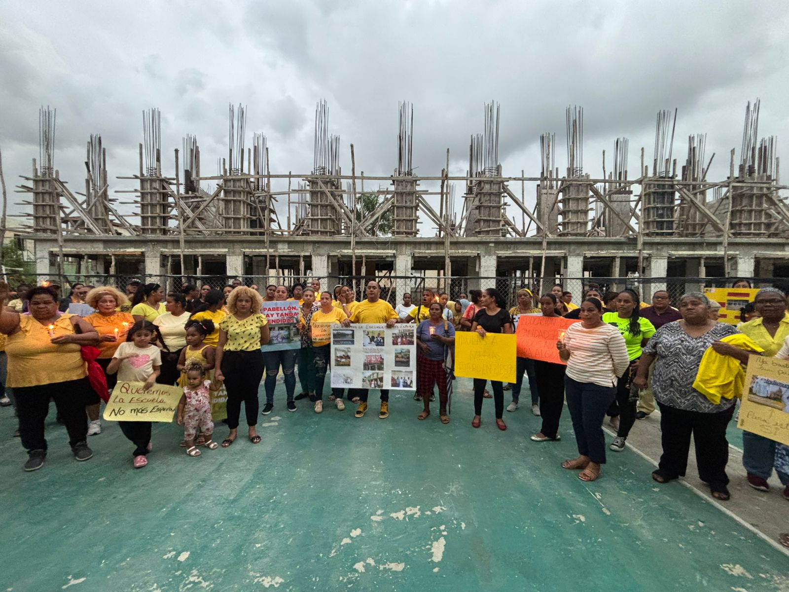 Con velas encendidas, pancartas, consignas y vistiendo de amarillo, cientos de padres y madres protestaron frente a la Escuela Parroquial Cristo Rey, en el Distrito Nacional, para exigir al Gobierno, a través del Ministerio de Educación (MINERD), la conclusión del pabellón de secundaria, cuya construcción se encuentra paralizada desde hace más de tres años.